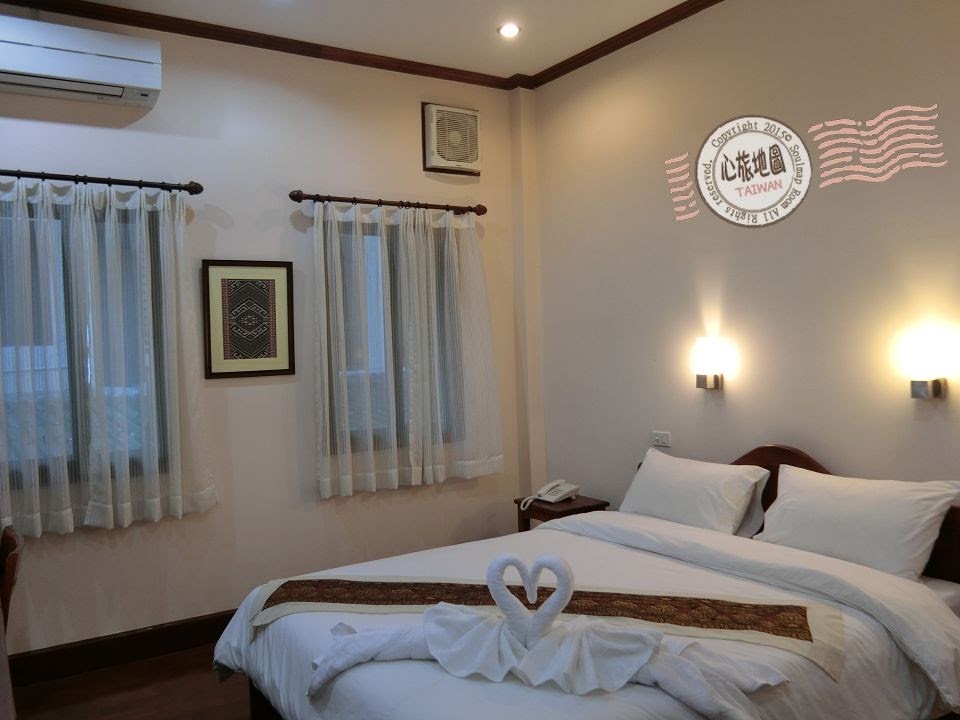 楊JO爬文後發現有人推薦一間在寺廟對面有陽台,早上(真的是一大清早五點半)可以直接從二樓陽台上看到僧侶托缽的傳統,位於主街Sisavangvong Rd.上,入住以後發現實在沒有很優,第一是他其實已經是主街尾巴,地點沒有很好;第二是乾淨度沒有真的很到位(我有點過敏反應);第三是櫃台好像完全不懂英文,我在說話時發現沒有反應,不是聽不懂大概就是服務態度不佳。所以在出發去旺陽之前,我們就打算再回到龍坡邦不續住了,於是開始找尋另外的住宿。七月的寮國其實有很多空房,旅館也沒有真的很難訂,我們通常都是到達當地才決定會入住哪裡,推薦這間Saynamkhan Hotel是因為楊JO被他們舊館的咖啡廳吸引(居然忘記照相),跑進去問有沒有房間,結果很幸運老闆說它們有新館,而且距離不遠,可以帶我們去看看,還會給我們折扣。所以就這樣我們撿到一間。這是我們在附近找到算很不錯的住宿。先來看房間。